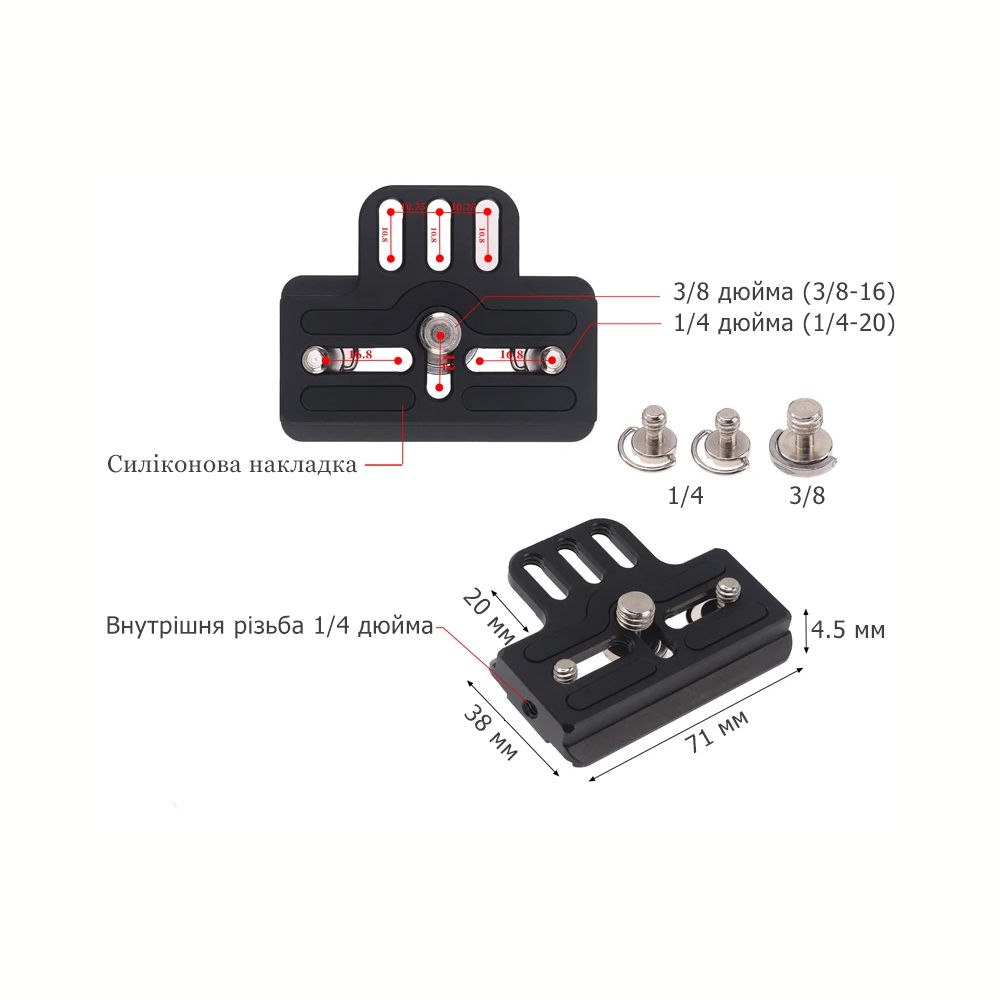 Площадь имеет винт 1/4 дюйма для крепления камеры и 2 отверстия с внутренней резьбой 1/4. Винт съемный, его можно вытащить и заменить другим винтом для штативных площадок.