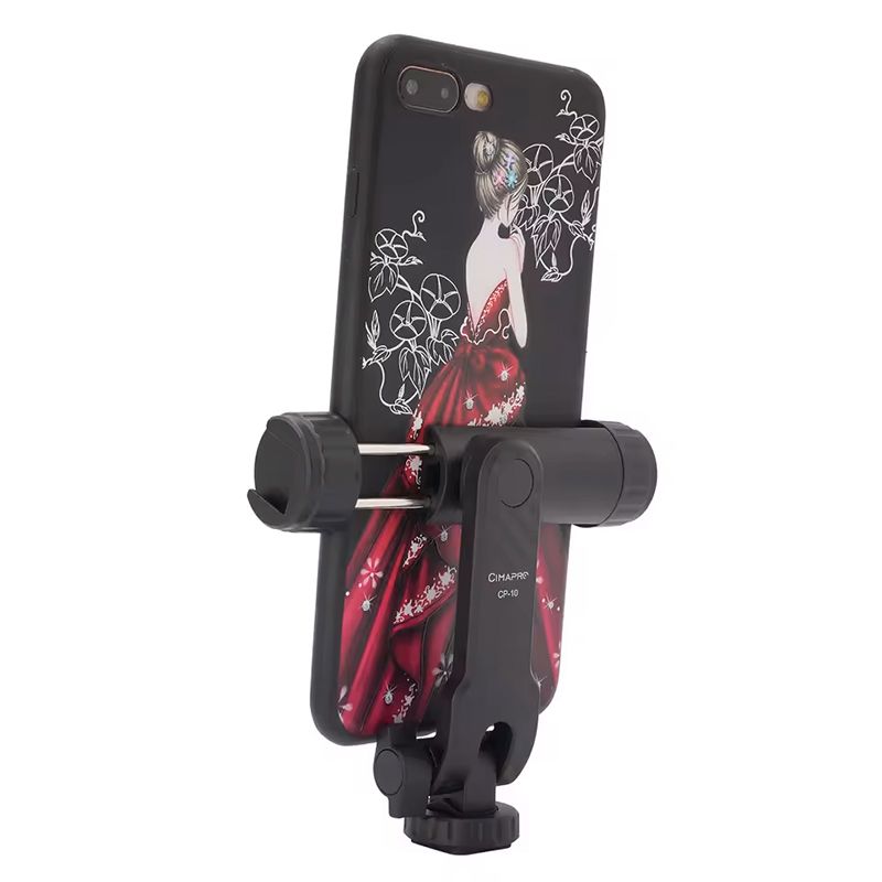 Тримач смартфона Cimapro CP-10 з башмаком - це тримач для смартфона з можливістю встановлення додаткового обладнання та обертання на 360 градусів. Тримач застосовується для встановлення смартфона на башмак фотокамери, штатив, монопод, студійну стійку та інше обладнання, яке оснащене стандартним гвинтом 1/4 дюйми або стандартним "башмаком".